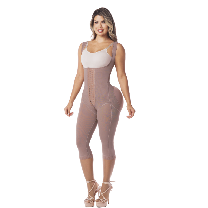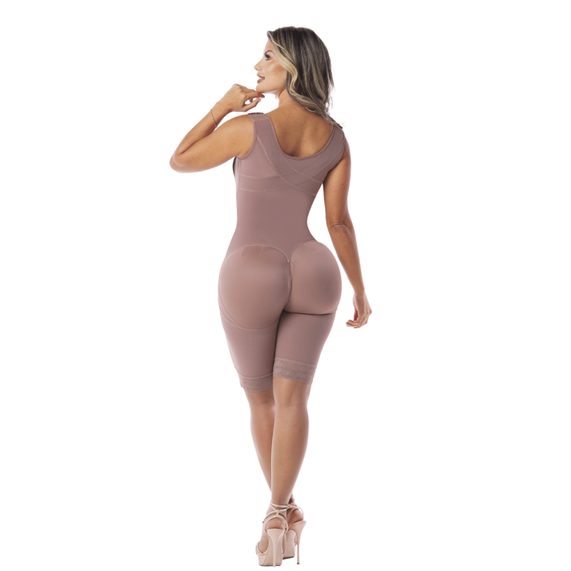 Faja de alta compresión con cobertura hasta la rodilla, diseñada para moldear la silueta, mejorar la postura y apoyar la recuperación postquirúrgica y postparto. Con diseño de pecho libre y efecto realce de glúteos.