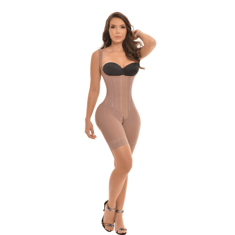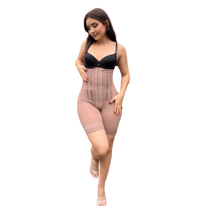 Faja moldeadora de alta compresión con 9 varillas estructurales (delanteras, laterales y traseras) y efecto reloj de arena, ideal para definir la cintura y estilizar la silueta. Con diseño de pecho libre, espalda alta y efecto push-up de glúteos.