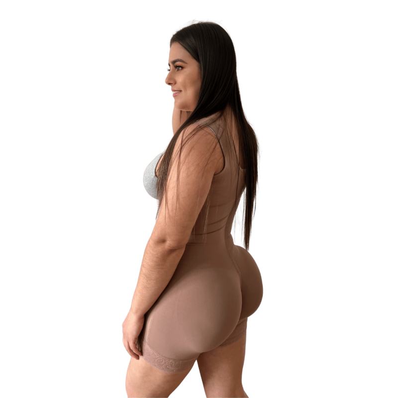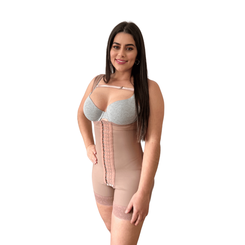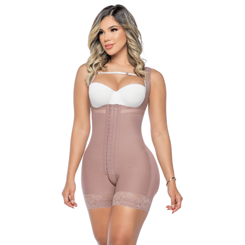 Faja de alta compresión con varillas de soporte, diseñada para moldear la figura, definir la cintura y mejorar la postura. Con diseño de pecho libre y efecto realce de glúteos.