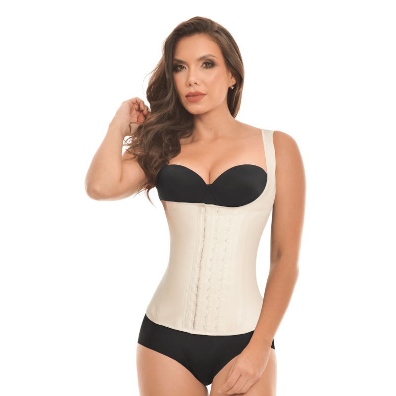 Chaleco de látex moldeador que ofrece compresión firme y ayuda a definir la cintura. Su diseño de pecho libre permite mayor comodidad, mientras la espalda alta brinda soporte y estabilidad. Cuenta con 3 niveles de corchetes, varillas estructurales y tirantes gruesos para un ajuste seguro. Ideal para uso diario o entrenamiento.